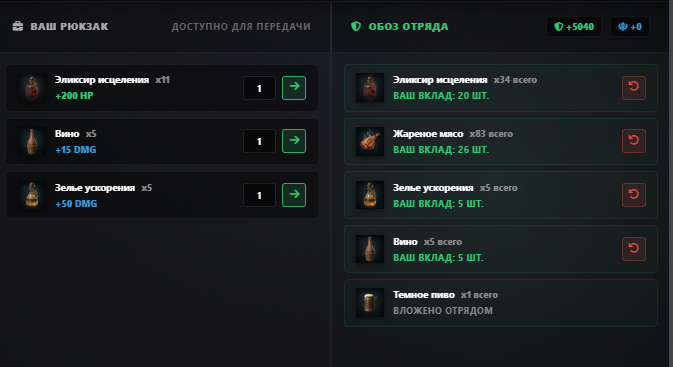 • Снабжение: Скидывайте в Обоз лечебные зелья, жареное мясо и похлебки. Всё это формирует общий резерв здоровья.